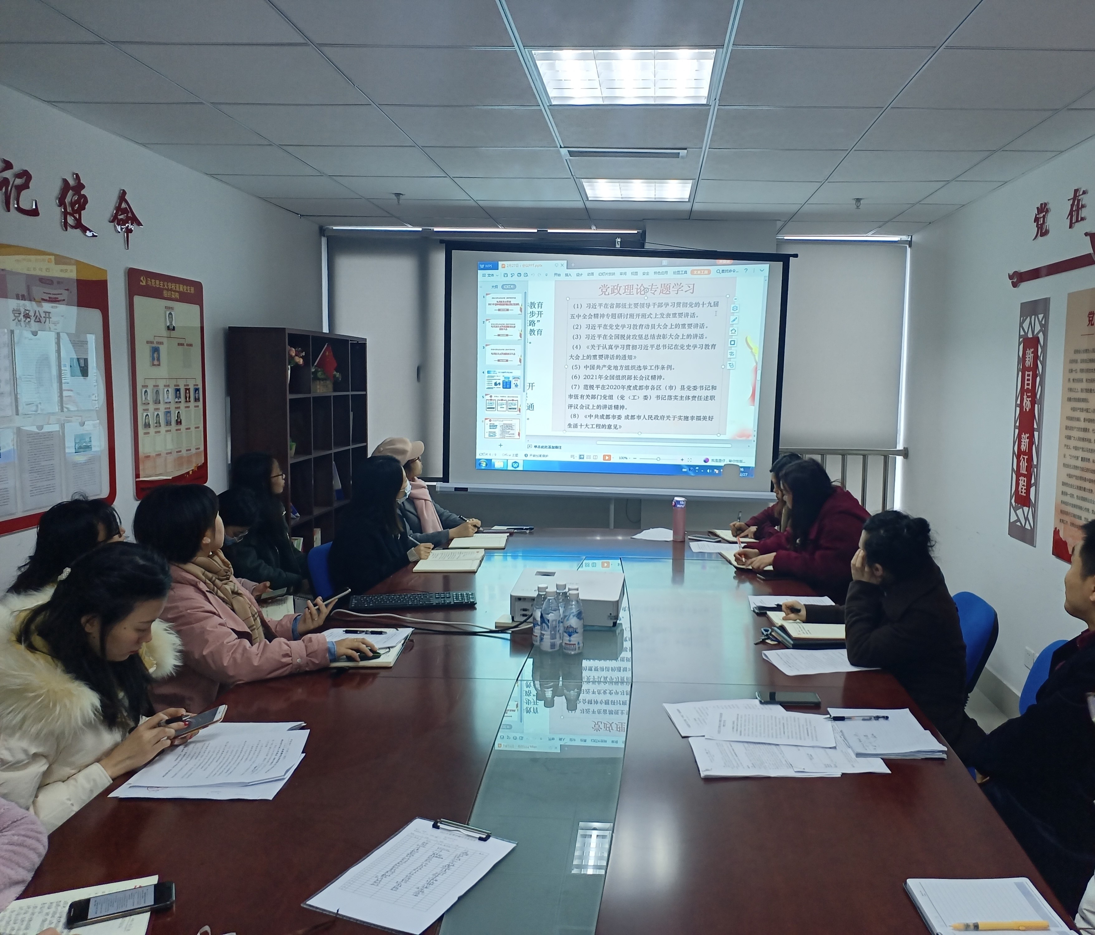 会上,全体党员教师还集体研学了习近平在省部级主要领导干部学习贯彻党的十九届五中全会精神专题研讨班开班式上发表重要讲话、习近平在党史学习教育动员大会上的重要讲话、习近平在全国脱贫攻坚总结表彰大会上的讲话,以及《中国共产党地方组织选举工作条例》、2021年全国组织部长会议精神、范锐平在2020年度成都市各区(市)县党委书记和市级有关部门党组(党〈工〉委)书记落实主体责任述职评议会议上的讲话精神、《中共成都市委 成都市人民政府关于实施幸福美好生活十大工程的意见》等重要文件精神。