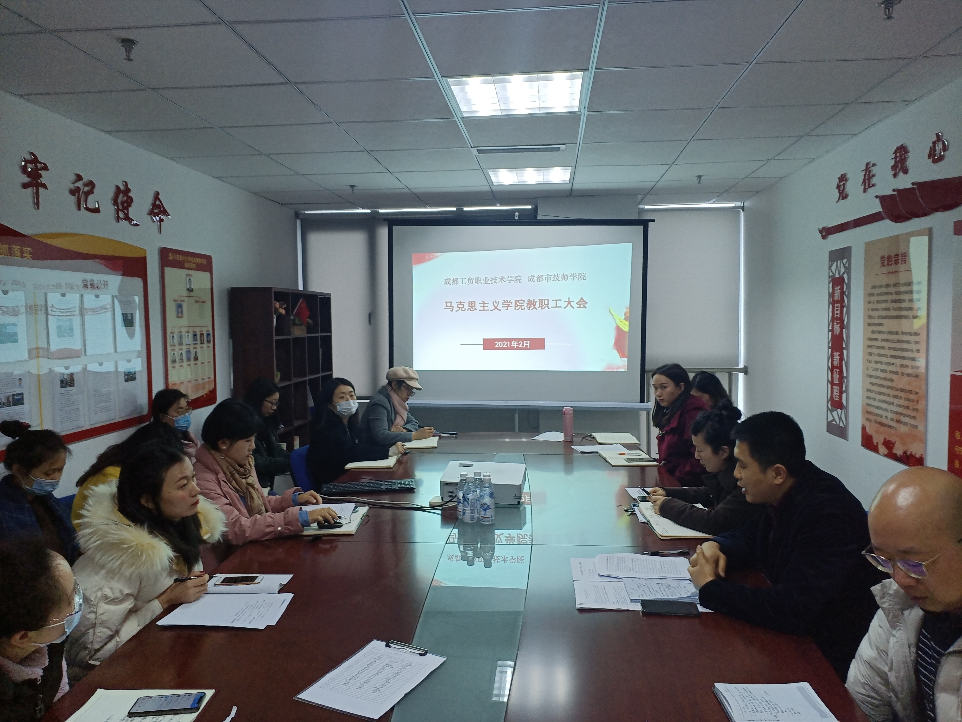 会上,张雪通报了《36365线路检测中心‘十四五’规划》和《36365线路检测中心2021年寒假重点工作推进情况及新学期主要工作计划》,对2021年学院重点工作提出具体要求:一是紧紧围绕学校“十四五”规划,立足学校发展及人才培养实际,与成都市总工会共建产教融合型36365线路检测中心;二是发挥四川省高公司党建“双创”项目——“高校‘双带头人’教师党支部书记张雪同志工作室”引领作用,加强马院基层党建;三是紧抓师生各类思政教学竞赛,持续推进校级省级精品课程建设;四是办好社科基地研讨年会,面向省内外院校、科研院所、社科基地等单位,共同探讨当前职业院校提升党建工作理论与实践、工匠人才培养实践、社科普及创新策略等,为新时代职业院校高质量发展提供智力支撑;五是对标落实国家提质培优行动计划,围绕“成都工匠”为模范导向,探索“模范导向、标准对接、职技融通、质量控制”新型技能人才培养模式,实现技能育训优势共享,实施教学过程管理和质量保障等进行总结提炼,完成1个校级德育特色案例申报及推广;六是科学重构马院目标考核体系,广泛征求学院教职员工意见及建议,作为学院绩效考核、职称评聘、评先评优的重要依据,为马院“十四五”发展构建有效的制度保障。